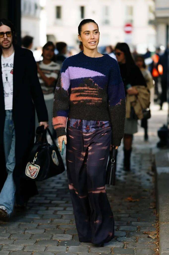 针织上衣在深色颜色和彩色之间的搭配让服装的花纹多了一些图案的艺术感活力,和花纹下装的搭配也多了质感的差异。