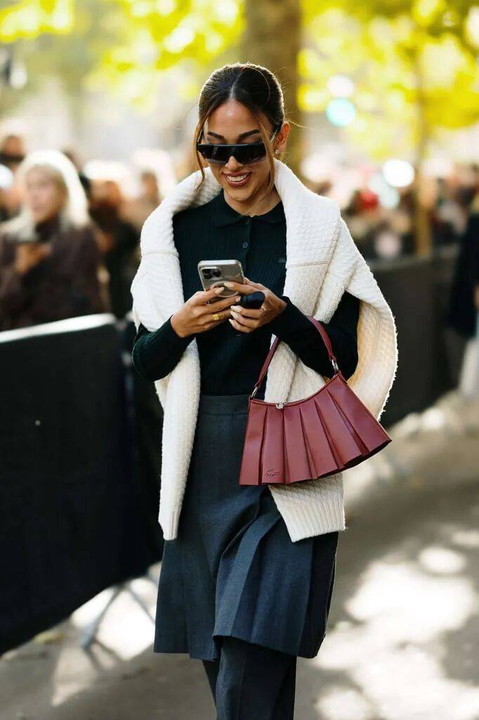 黑色等深色颜色为主的穿搭中,以白色的针织服装以披挂的设计,带来层次和一些休闲的时髦感。
