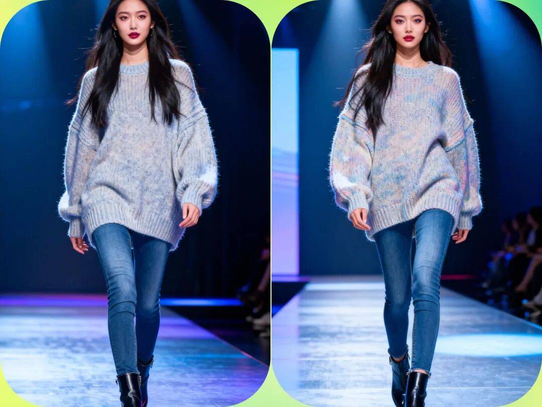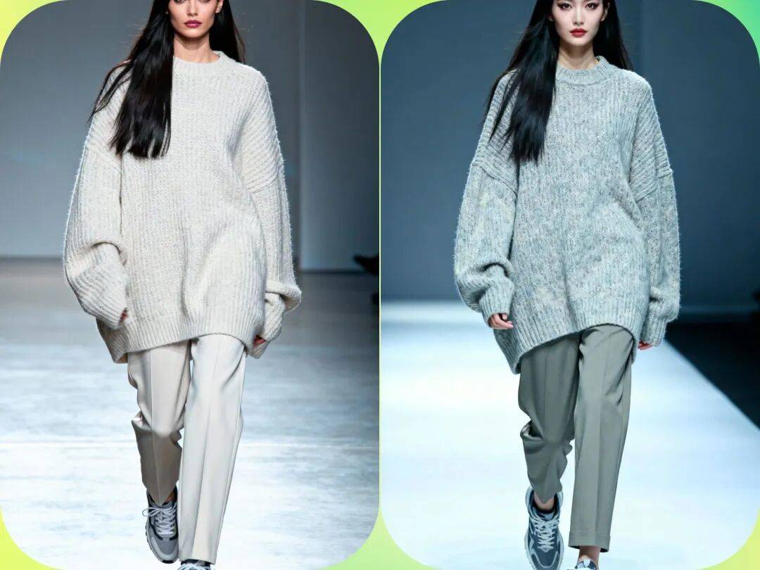 流行趋势:流行 oversized针织衫搭配宽松牛仔裤,打造“松松垮垮”的休闲感。亮色系针织衫(如宝蓝、绛红、姜黄色)成为冬季的一抹亮色。