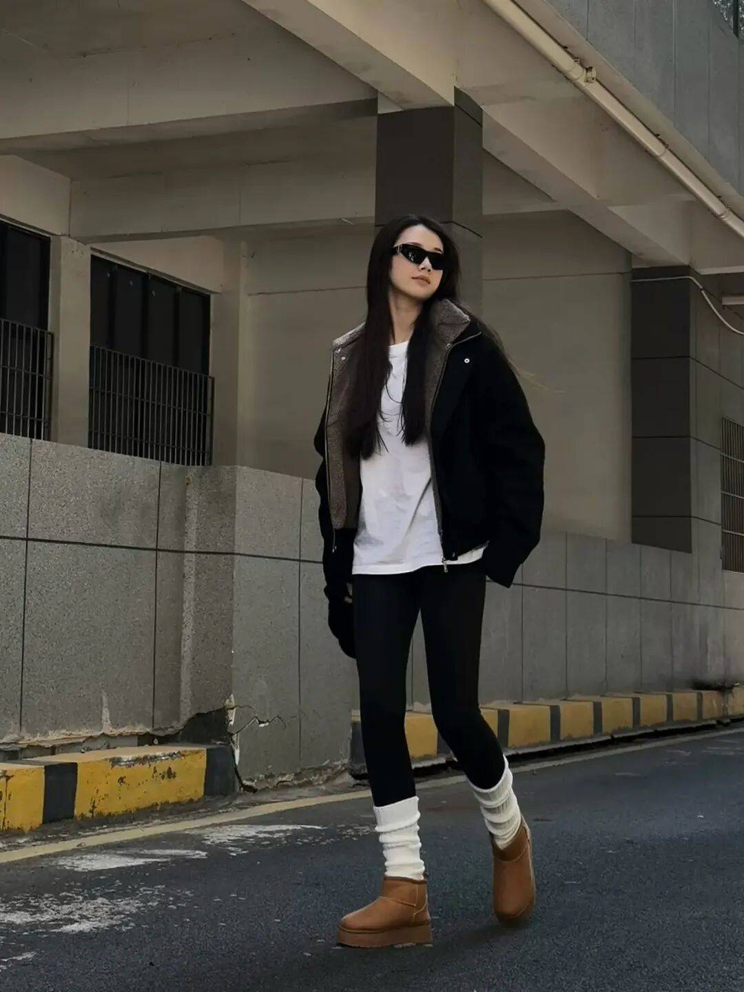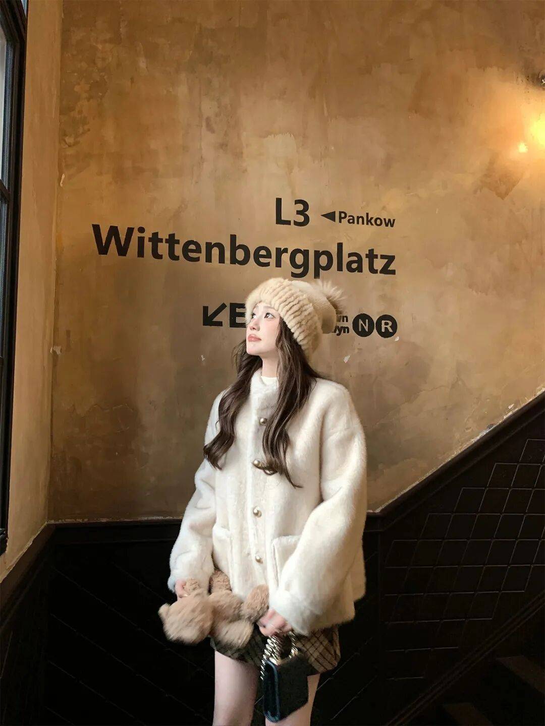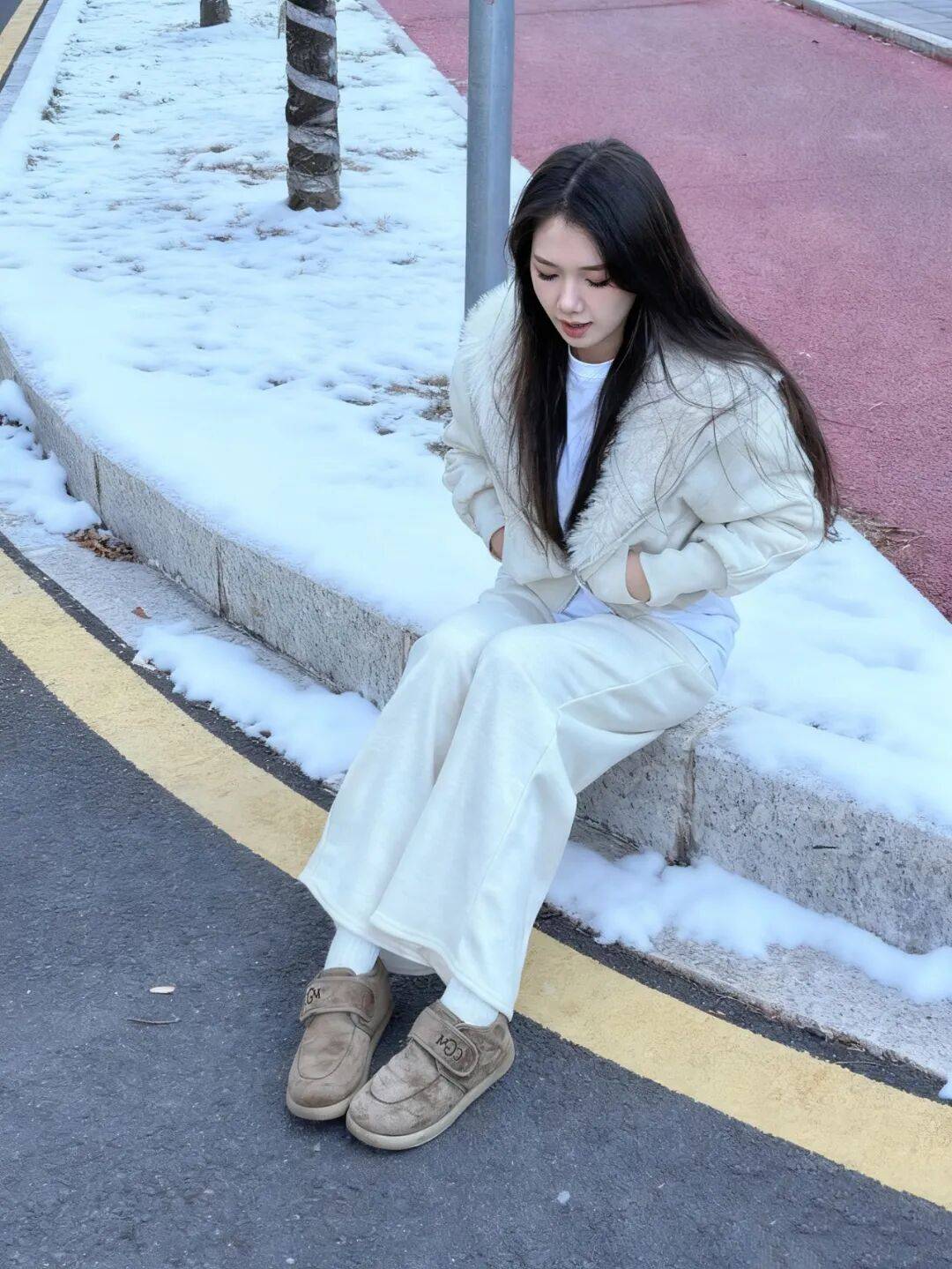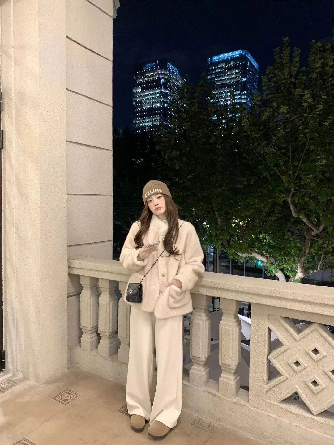 延续毛绒单品保暖性,下身替换为白色直筒裤或奶奶裤,强化温柔气质,适合追求轻熟风格的女性。
