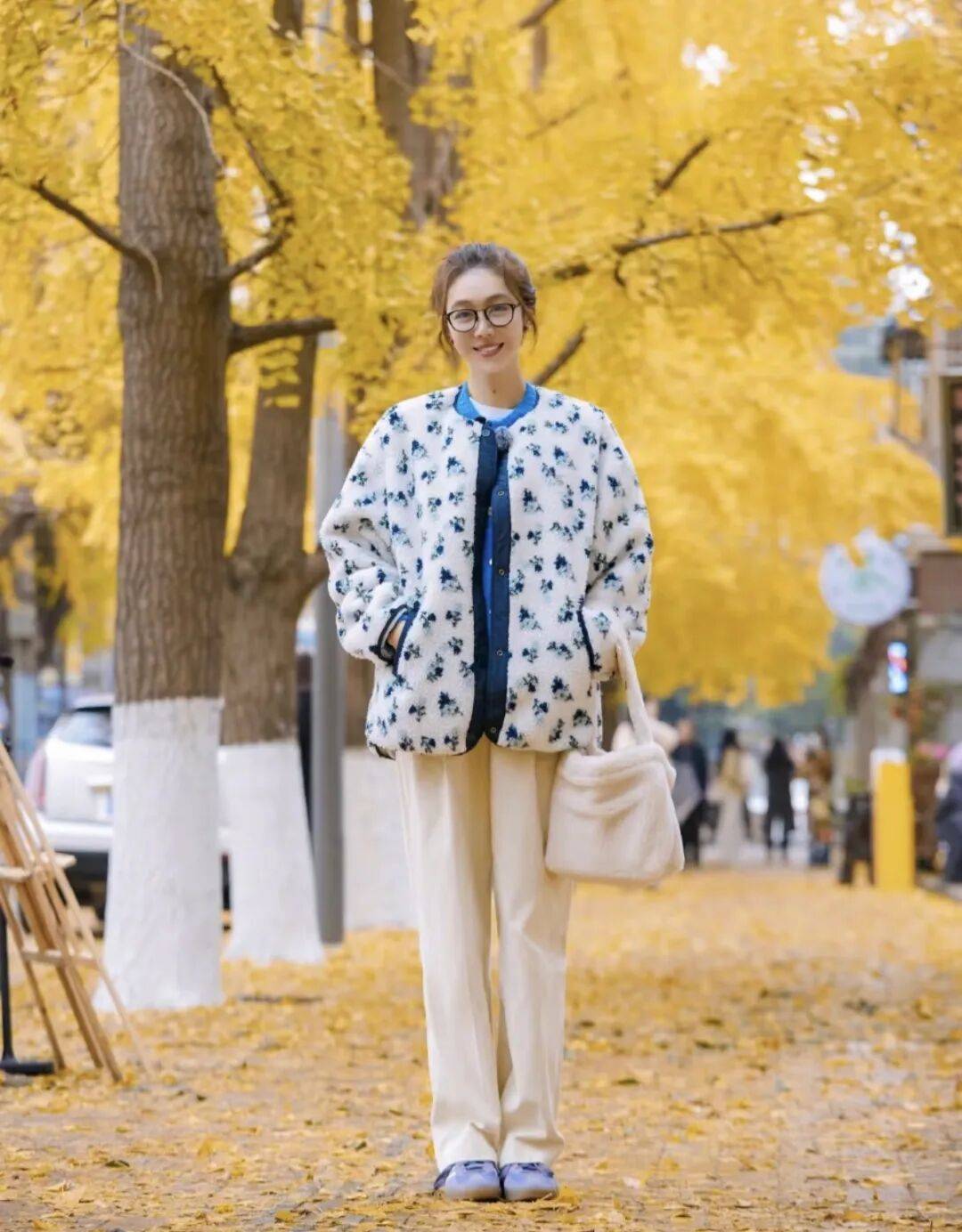 碎花毛绒外套+蓝色针织开衫+白色直筒裤
