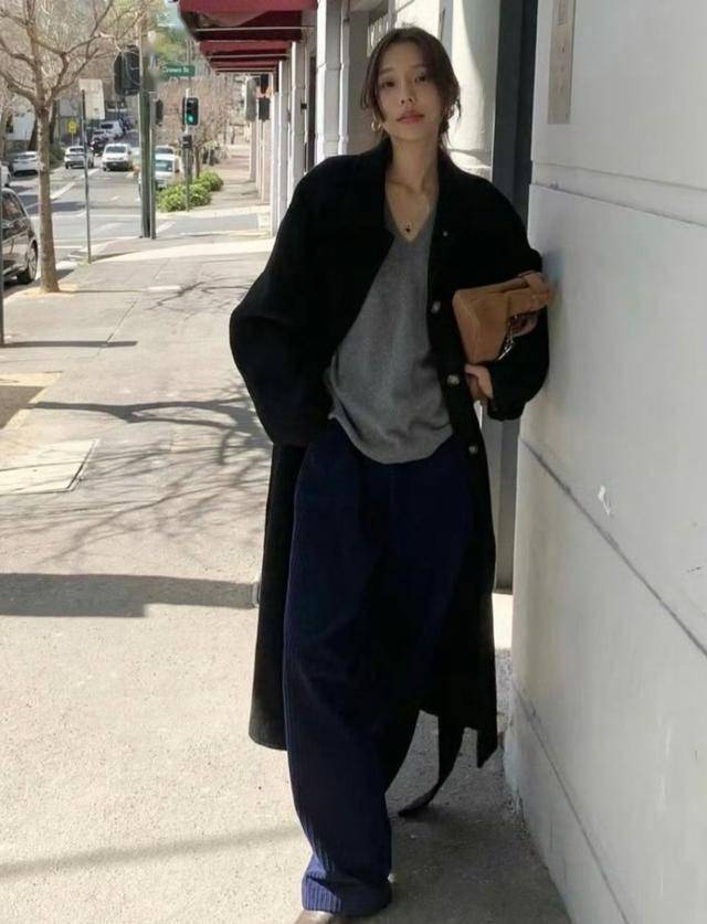 黑色大衣里面叠穿V领毛衣,把脖子露出来,轻松营造出呼吸感。