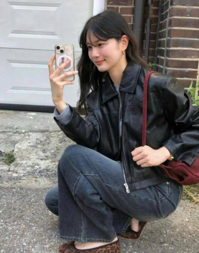 哑光质感的黑色皮衣,只需要一条牛仔阔腿裤,就能平衡穿搭,鞋子选择豹纹款,让造型更具辨识度。