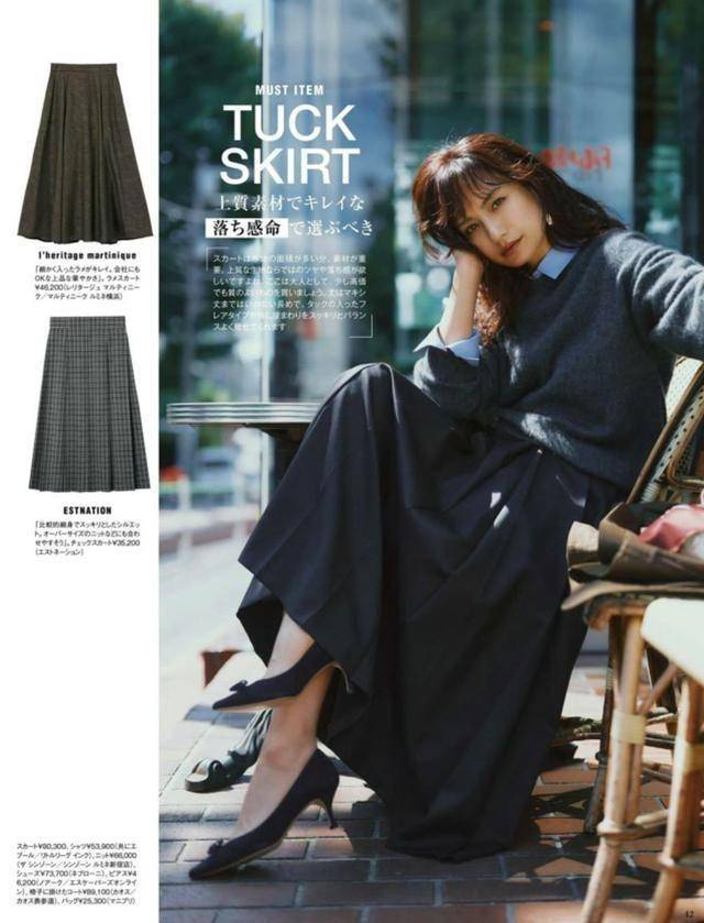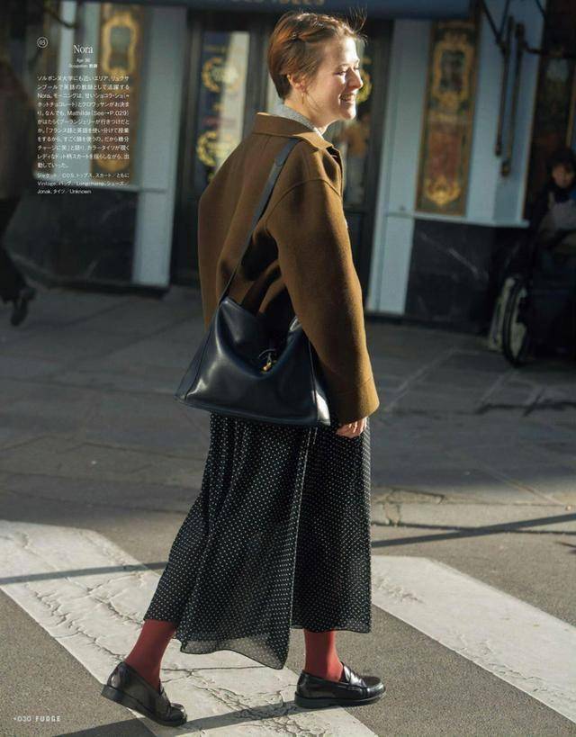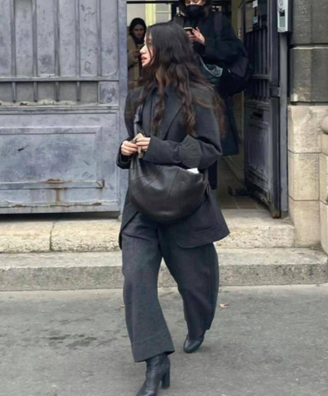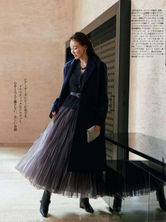 黑色百褶裙配灰色西装,“大一码”的西装外套,将身体裹在里面,超有安全感。