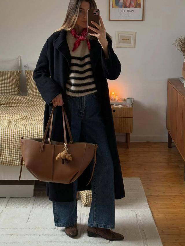 鱼骨纹设计的长条丝巾,围在颈部的那一刻,细节感瞬间拉满。