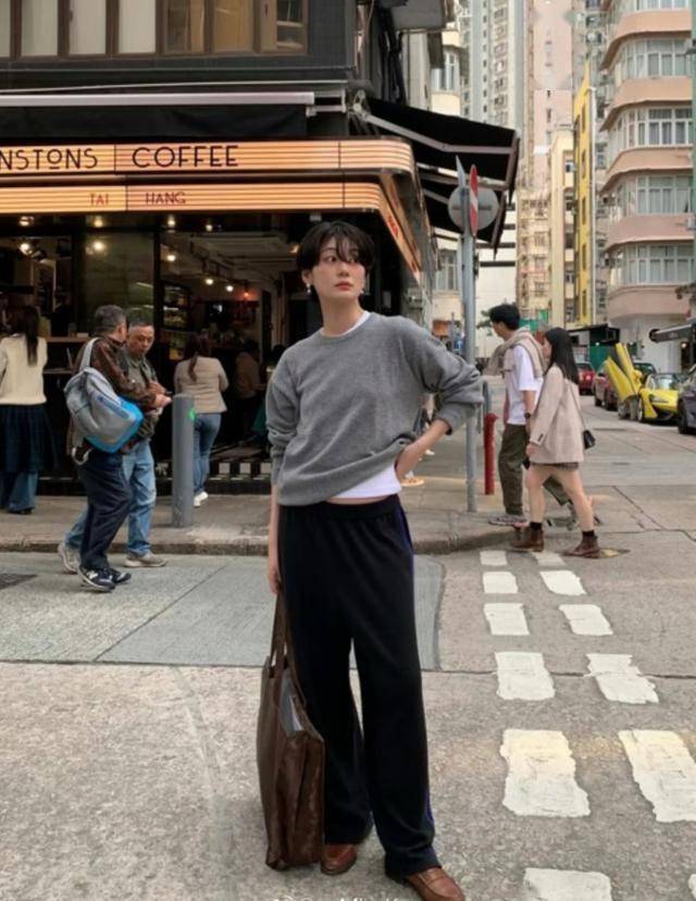 灰色套头毛衣叠穿白T恤,露出衣领、下摆,配条黑色直筒裤,层次感拉满!