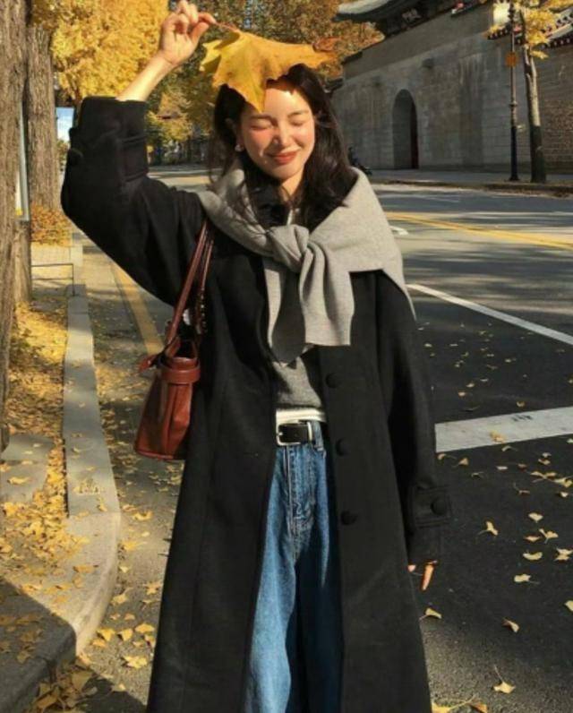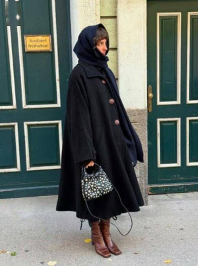 黑色大衣叠穿会披肩,干练利落又文艺,日常通勤都能穿。