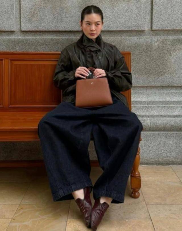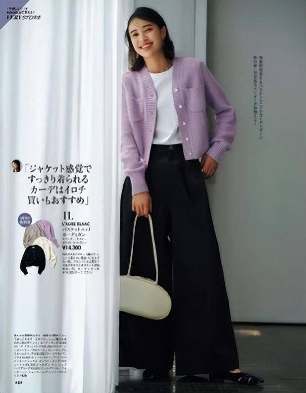 小个子请锁死黑色短上衣,搭配高腰阔腿裤,领款棕色手提包,显高又精致。