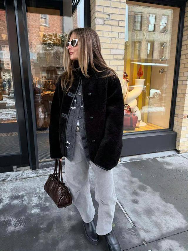 在黑色外套里面,叠穿灰色毛衣,让造型更有层次感。