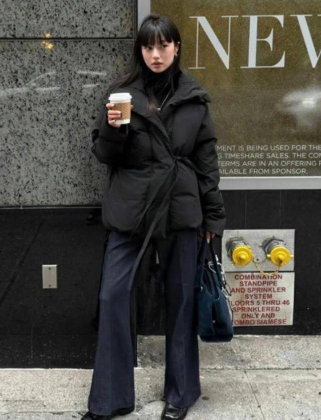 黑色羽绒服要系上腰带穿,大翻领的设计,叠穿一件黑色高领打底,显得脖子又细又长,戴根锁骨链,让你美到骨子里。
