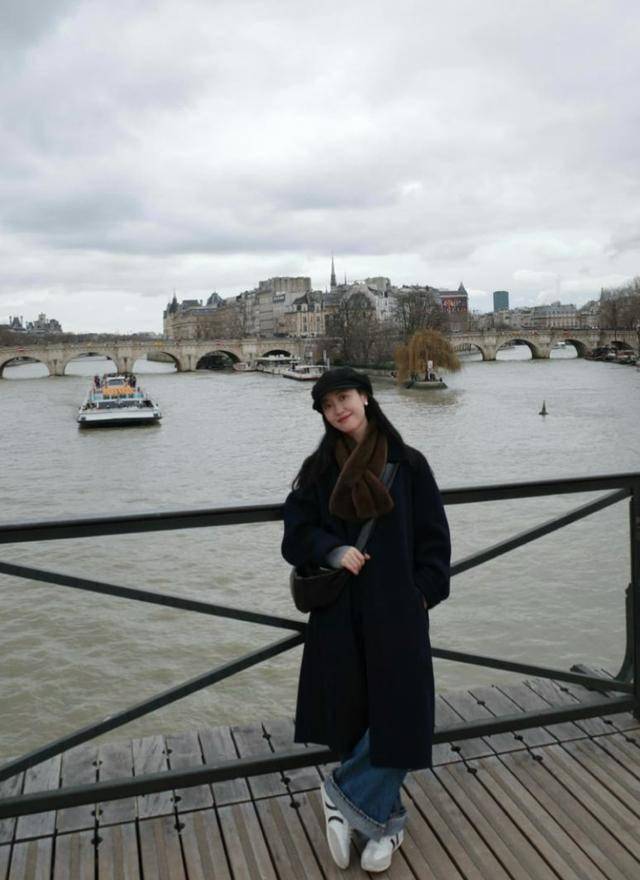 藏蓝色的围巾裹在头上,套上一件A字型大衣,可爱又俏皮。