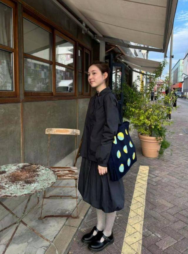 在黑色半身裙上,均匀的点缀上波点元素,造型则会更加灵动。
