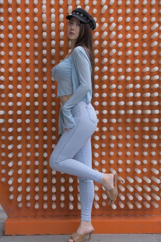 紧身/高腰牛仔裤+上衣短款/露腰设计是身材修饰的关键组合,搭配高跟鞋或短靴能进一步拉长腿部比例。