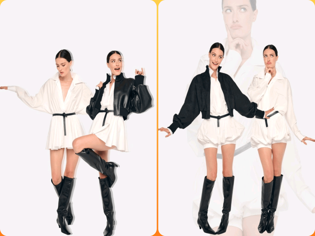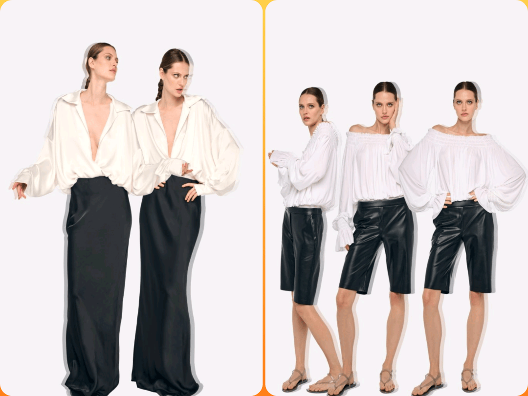 白色上衣和黑色下装之间的搭配,在色彩的对比中带来了撞色冲击感,以落肩的廓形、一字肩的设计等带来了细节的设计感。