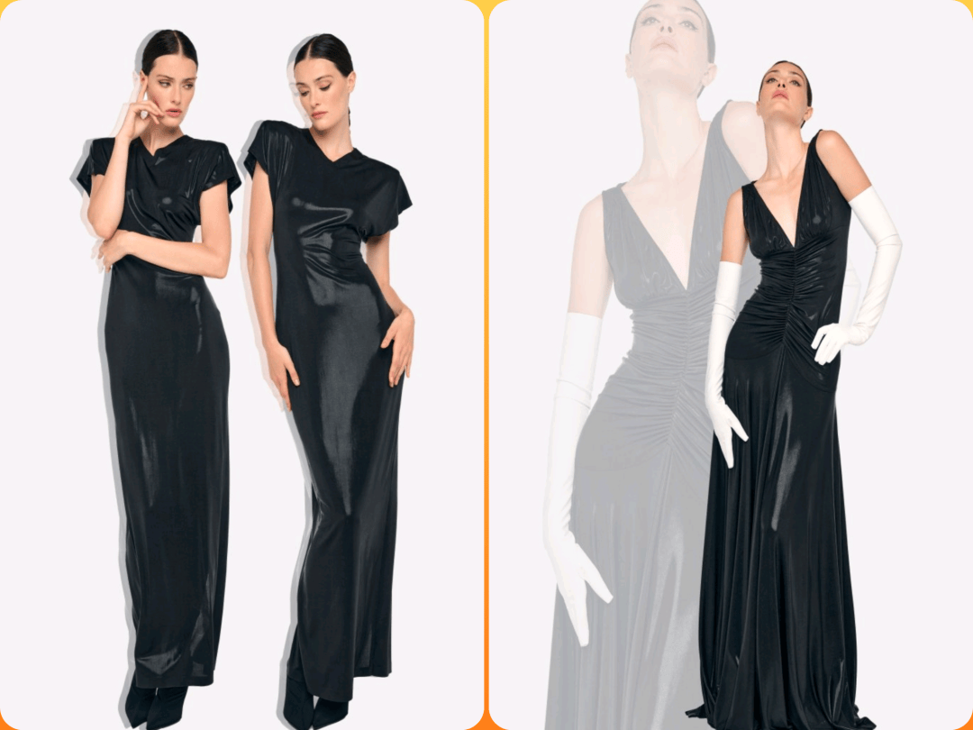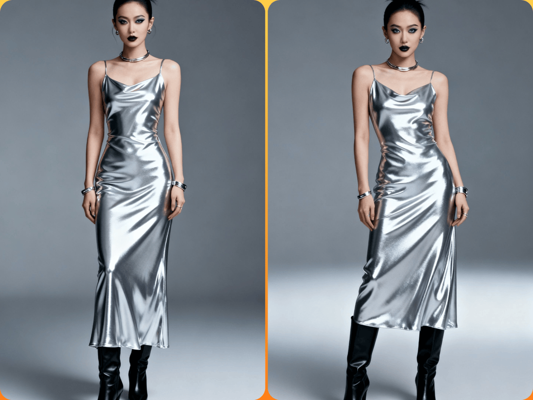 液态光泽连衣裙 + 尖头靴:通过材质碰撞提升华丽度,配以极简金属首饰,聚焦视觉焦点。