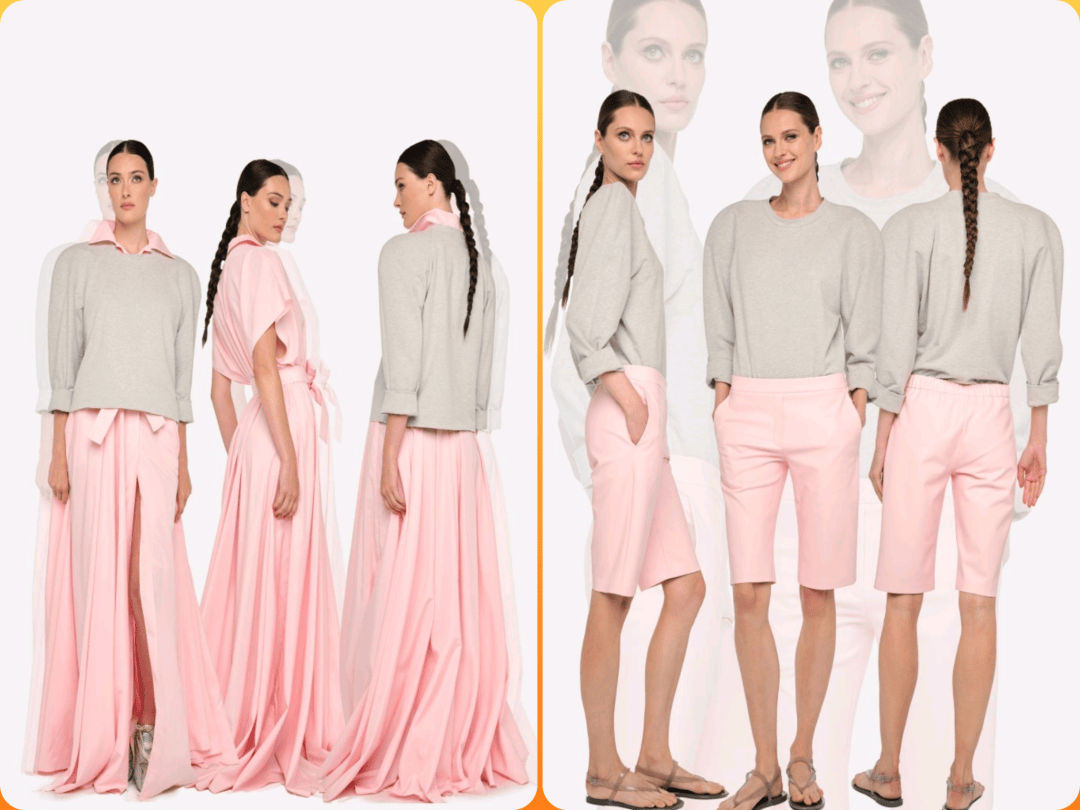 灰色休闲上衣在和粉色下装之间的搭配,在休闲日常的大方中,也以开叉裙摆增加了细节的设计感。