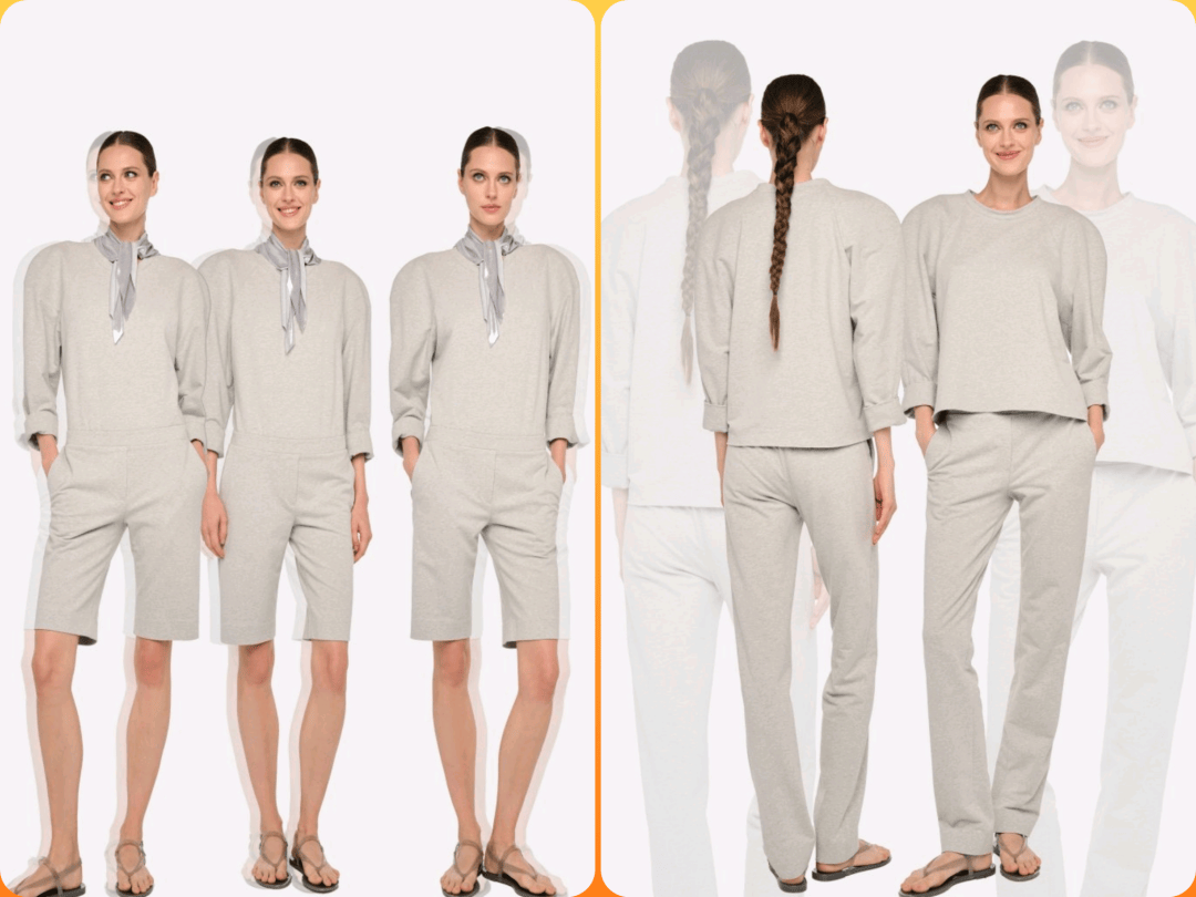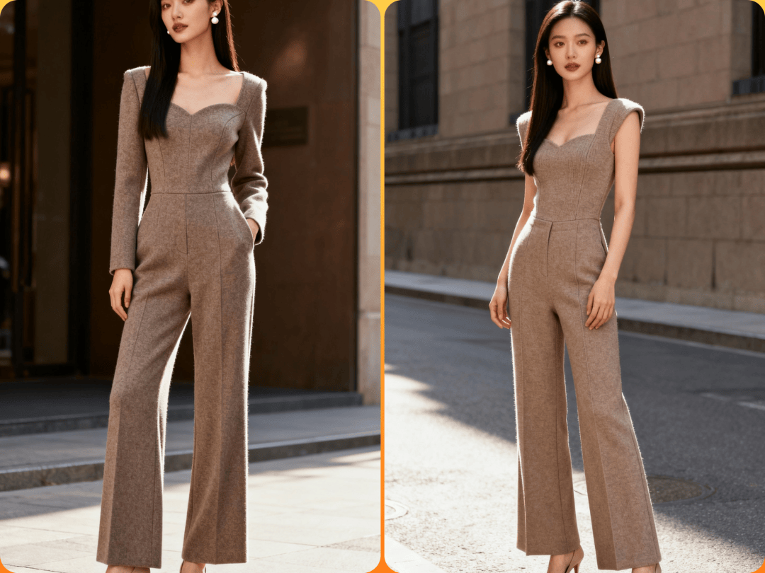 塑形肩线连体衣 + 西装阔腿裤:用毛圈布的柔软中和西装的正式,搭配裸色高跟鞋,打造“权力休闲”造型。