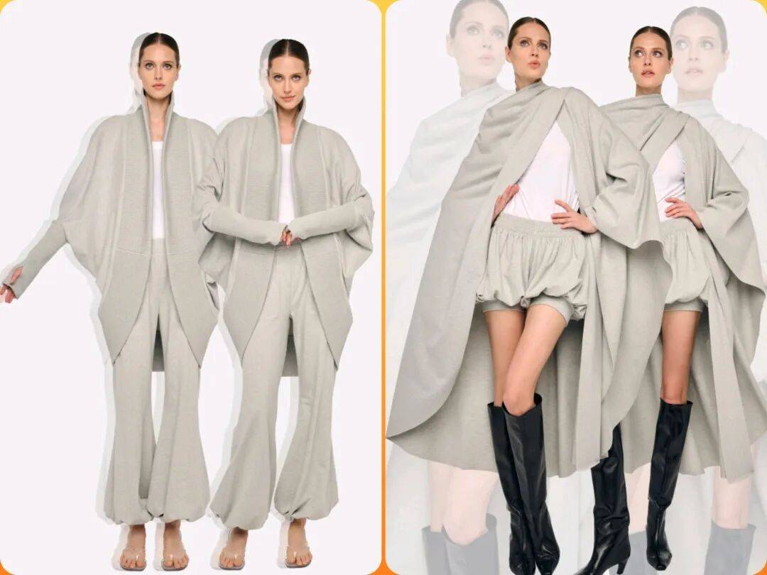 灰色颜色的低调大方在纯色的简约中,结合了斗篷披肩的元素,多了一些廓形感,而在和下装搭配的套装中,以白色休闲内搭的搭配,也多了层次和细节感。