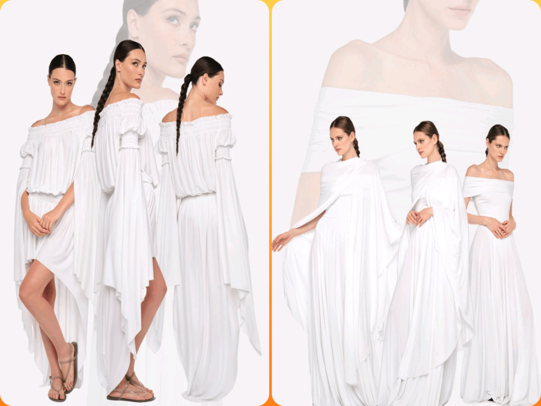 纯白色颜色的服装在色彩的低调干净的气质中,优雅的裙装结合一字肩、不规则下摆、廓形褶皱等设计,也为纯色的裙装增加了不少细节的设计感。
