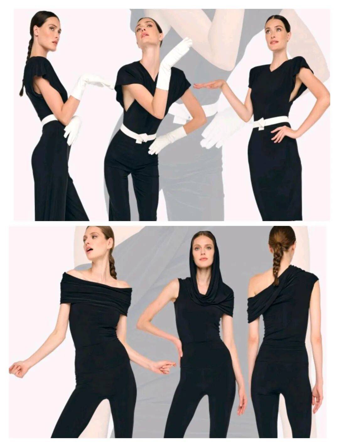 黑色颜色作为主要颜色的服装,结合一字肩、斜肩、随性褶皱等设计的出现,为这些黑色的服装在利落干练中也增加细节的亮点。