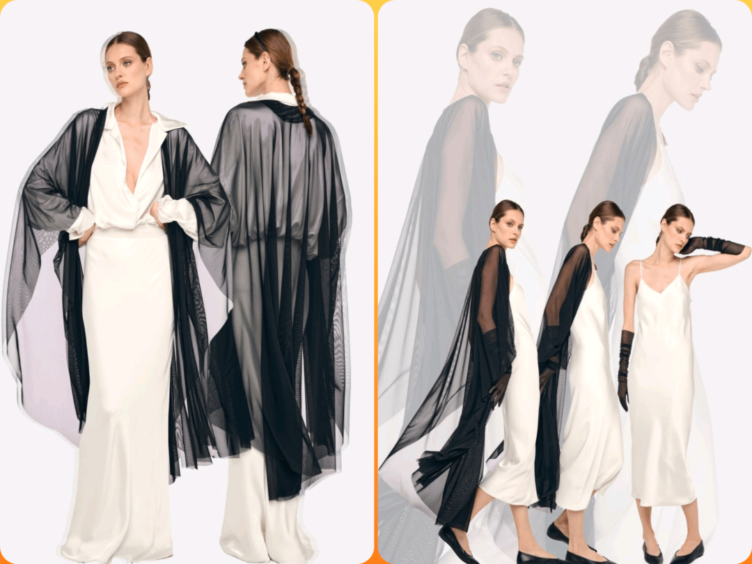 纯白色的裙装在优雅的气质上,温婉时尚,以黑色薄纱外搭进行搭配,还在视觉对比中多了朦胧和飘逸的气质。