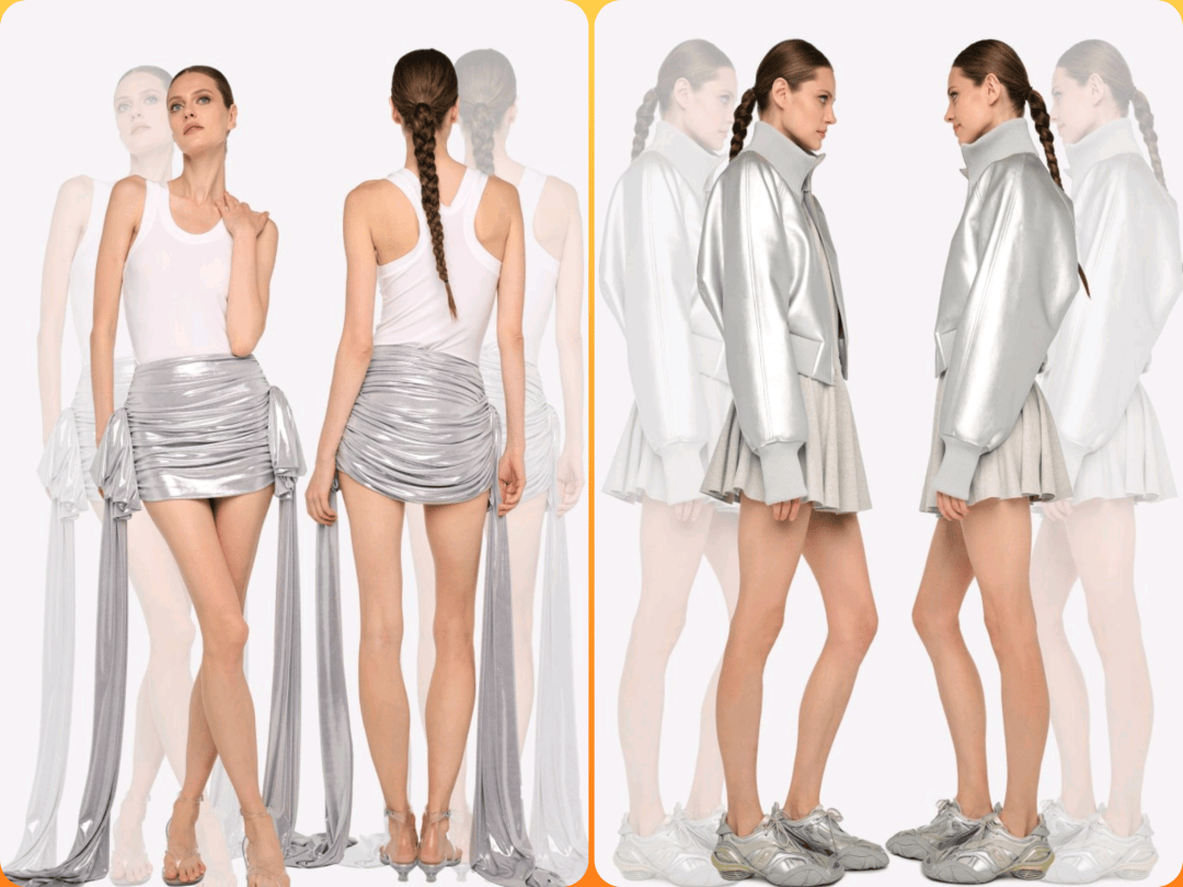 光泽的银色颜色在金属色调的冰冷中,多了一些优雅奢华的气质感,结合了横向褶皱、纵向褶皱等设计的线条细节感。