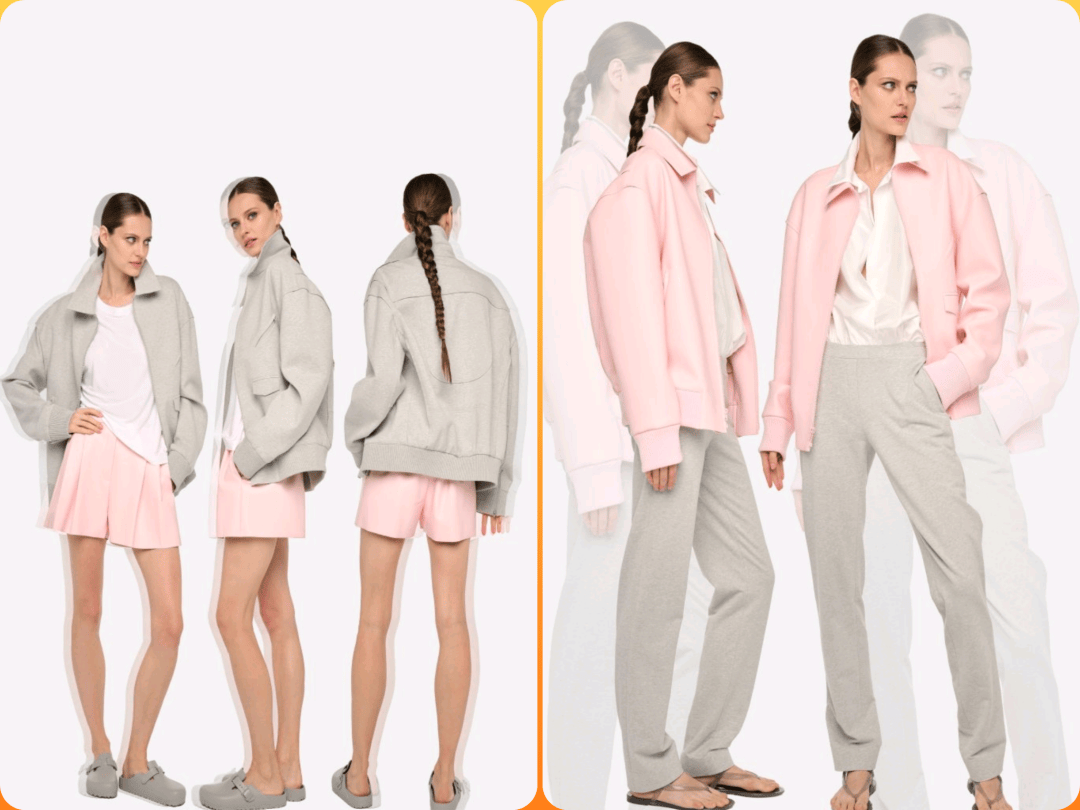 白色的内搭也在粉色夹克、灰色夹克、粉色短裤、灰色直筒裤等这些服装的相互的搭配中,休闲酷帅也在层次中多了利落感。