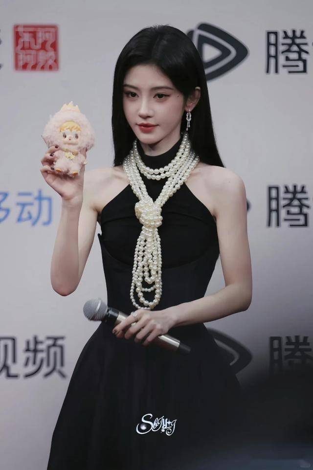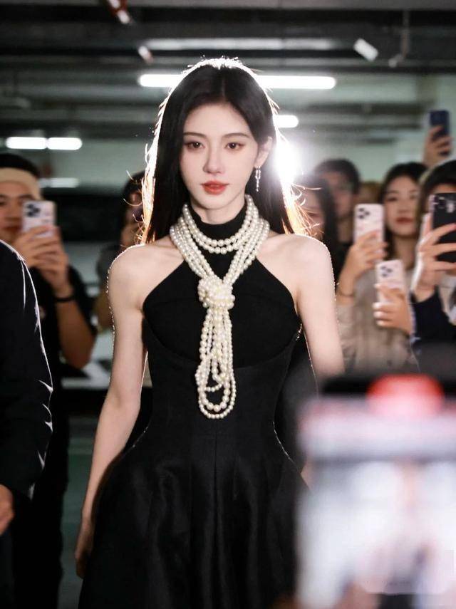 她穿着一件复古黑丝绒长裙,搭配一头乌黑亮丽的长直发,最吸睛的是脖子上那条珍珠项链——足有拇指粗的珍珠串成三圈,在灯光下闪闪发光,被网友调侃“比头还大”。