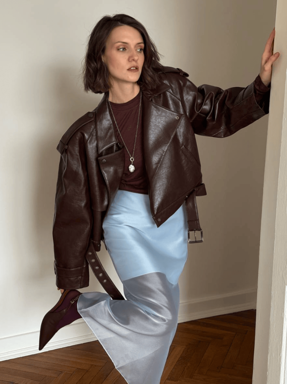 皮衣+丝袜/短靴:短发+皮衣的组合充满少年感与中性风,再搭配丝袜或短靴,刚柔并济,个性十足。
