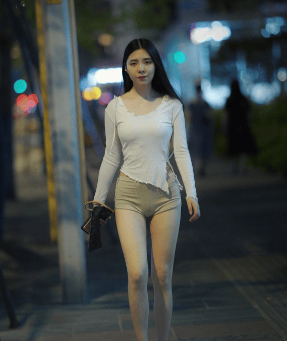 深蓝或黑色直筒短裤视觉收缩腿围,搭配V领垂感上衣(如褶皱泡泡袖),显瘦又藏肉。厚底鞋延伸小腿线条。