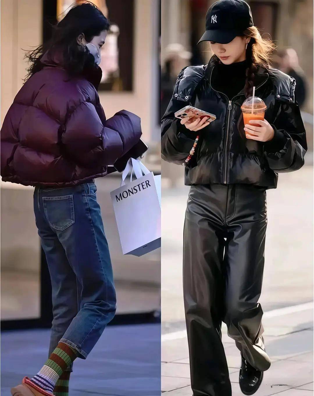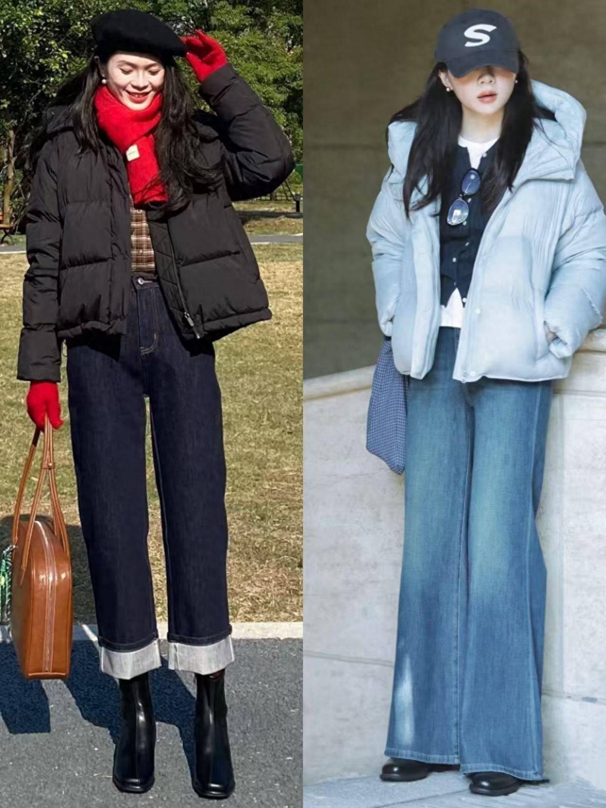 羽绒服敞开穿:内搭选择对比色(如深色外套+亮色内搭),打破厚重感。