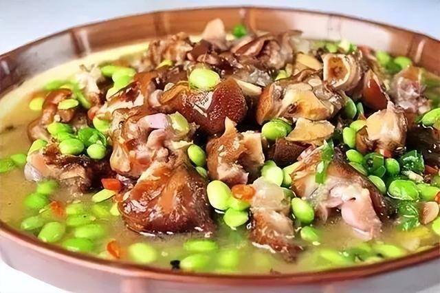 3、锅加油烧热,下小姜片、蒜片、青红椒丁、干青花椒等炒香,再掺入鲜汤并放入腊猪蹄、青豆,加盐、味精、料酒和鸡粉烧至猪蹄入味,起锅装盘成菜。