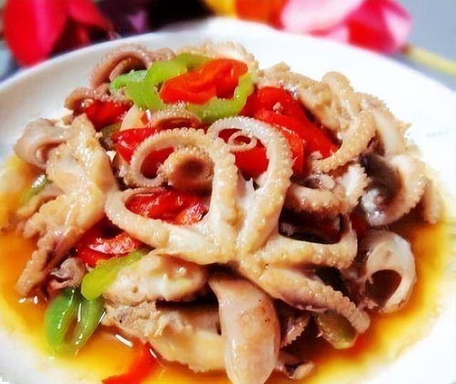 鱿鱼圈焯水:沸水加料酒、姜片,放入鱿鱼圈烫 30秒 捞出(去腥且保持脆嫩)。