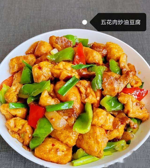 图片6:五花肉炒油豆腐,配有辣椒块与葱段,风格更偏川湘风味,辣中带喜。