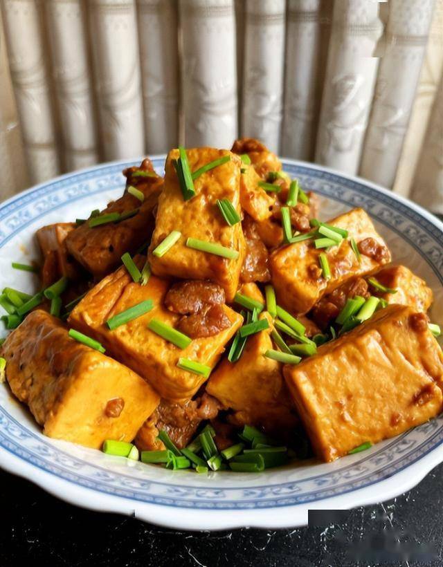 图片7:五花肉烧豆腐,豆腐呈棕黄色方块,点缀葱花,汤汁适中。