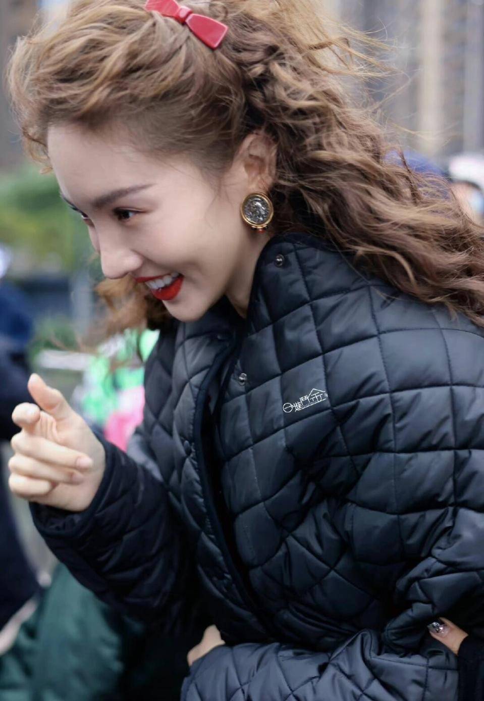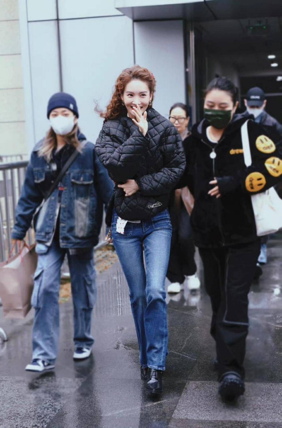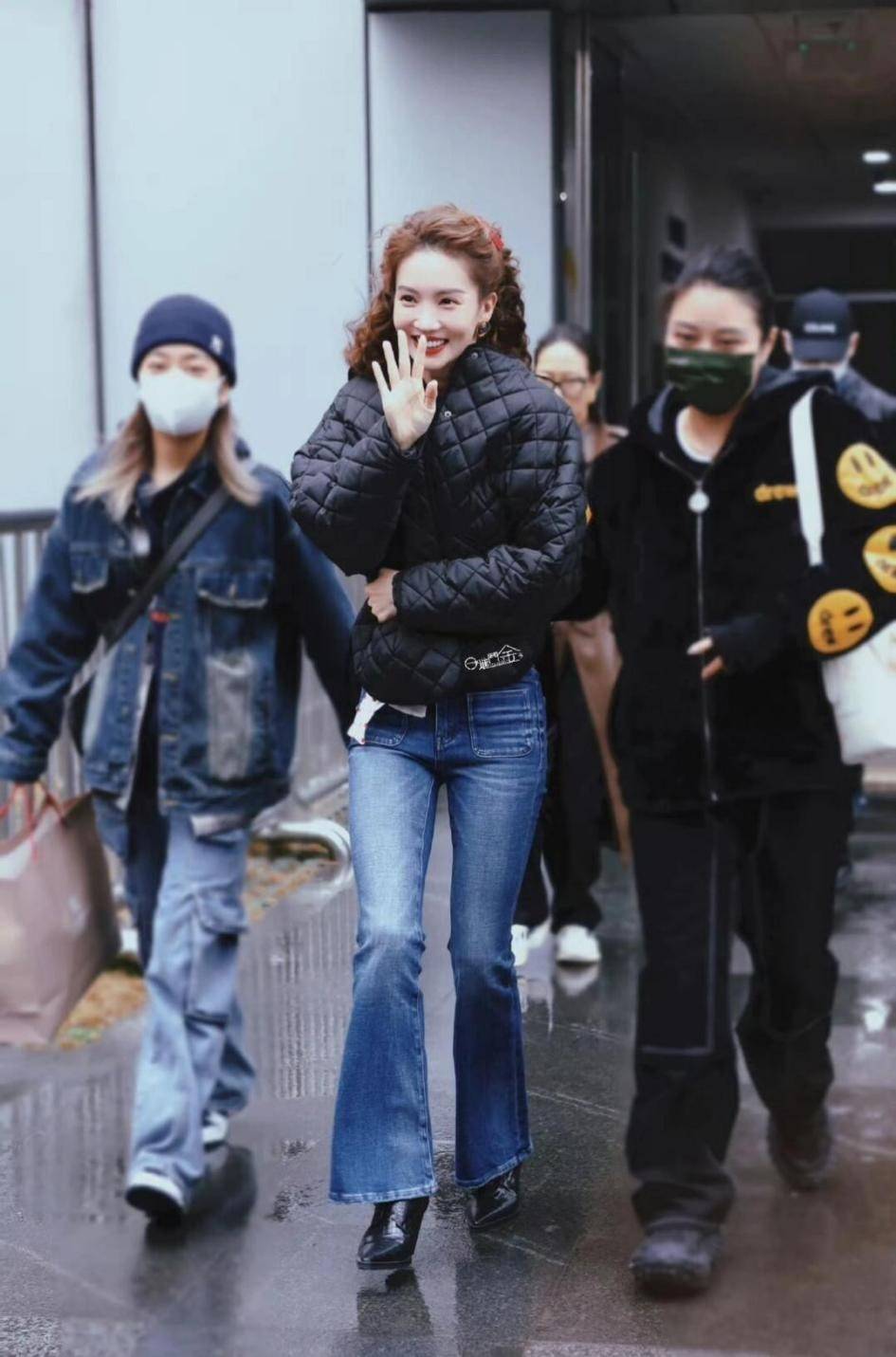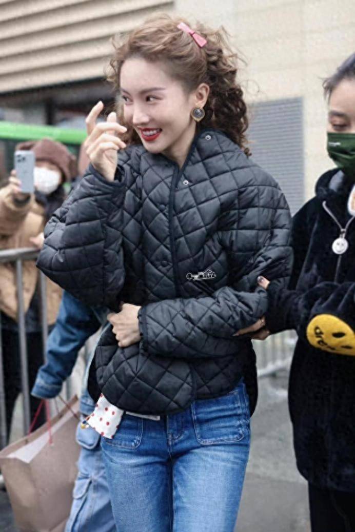 微喇牛仔裤:平衡棉服量感,修饰小腿线条,金晨常用此组合打造复古时髦感。