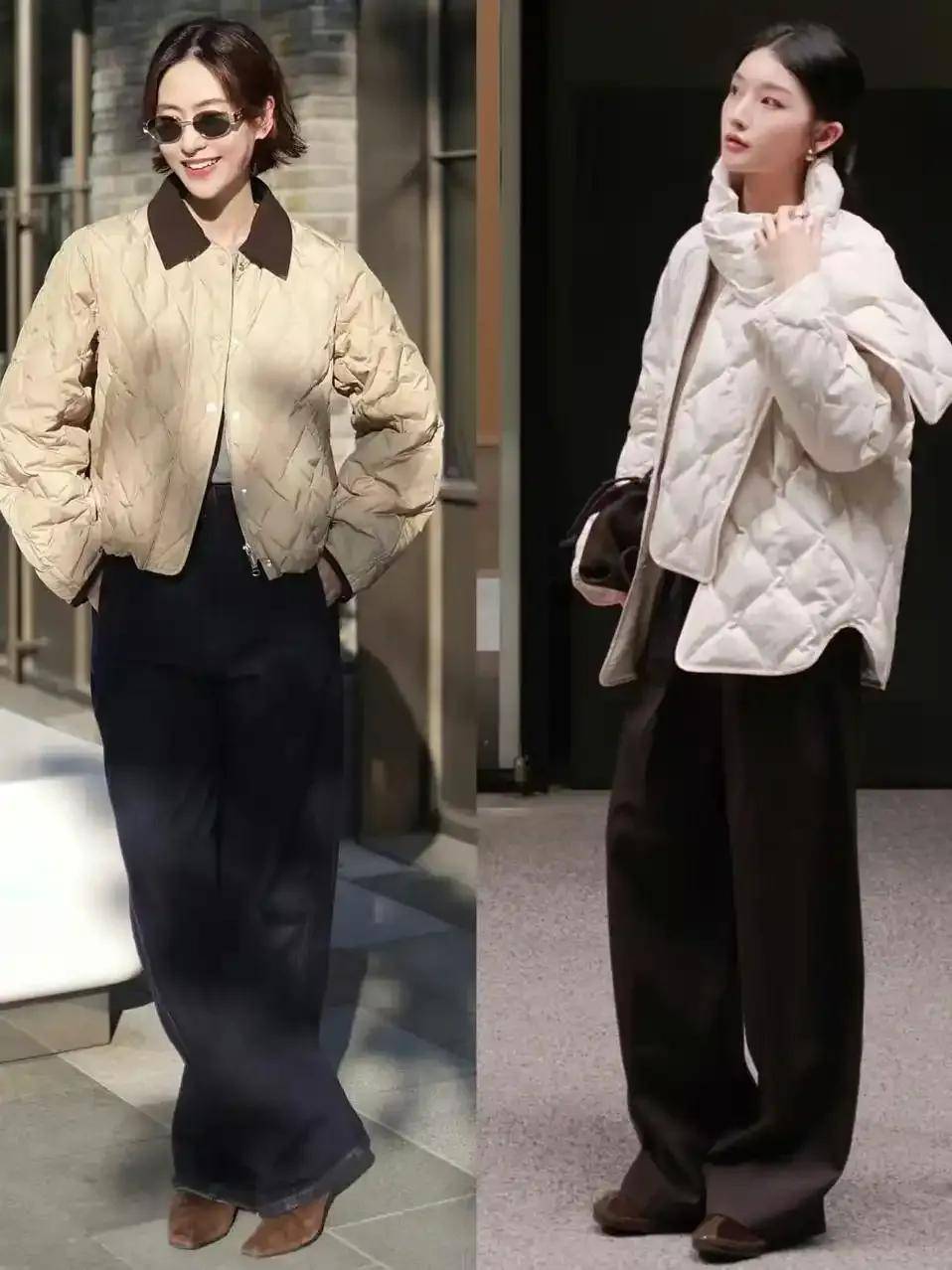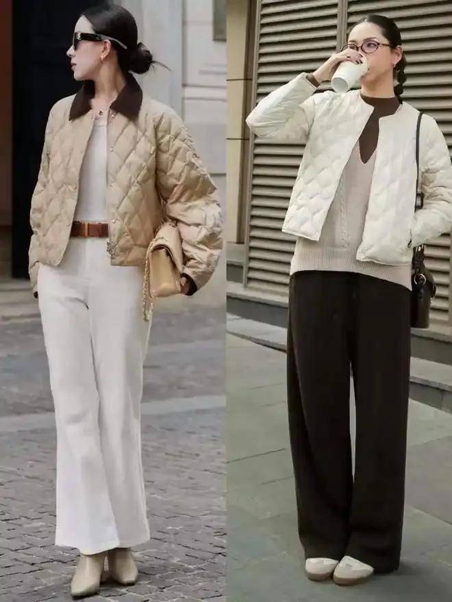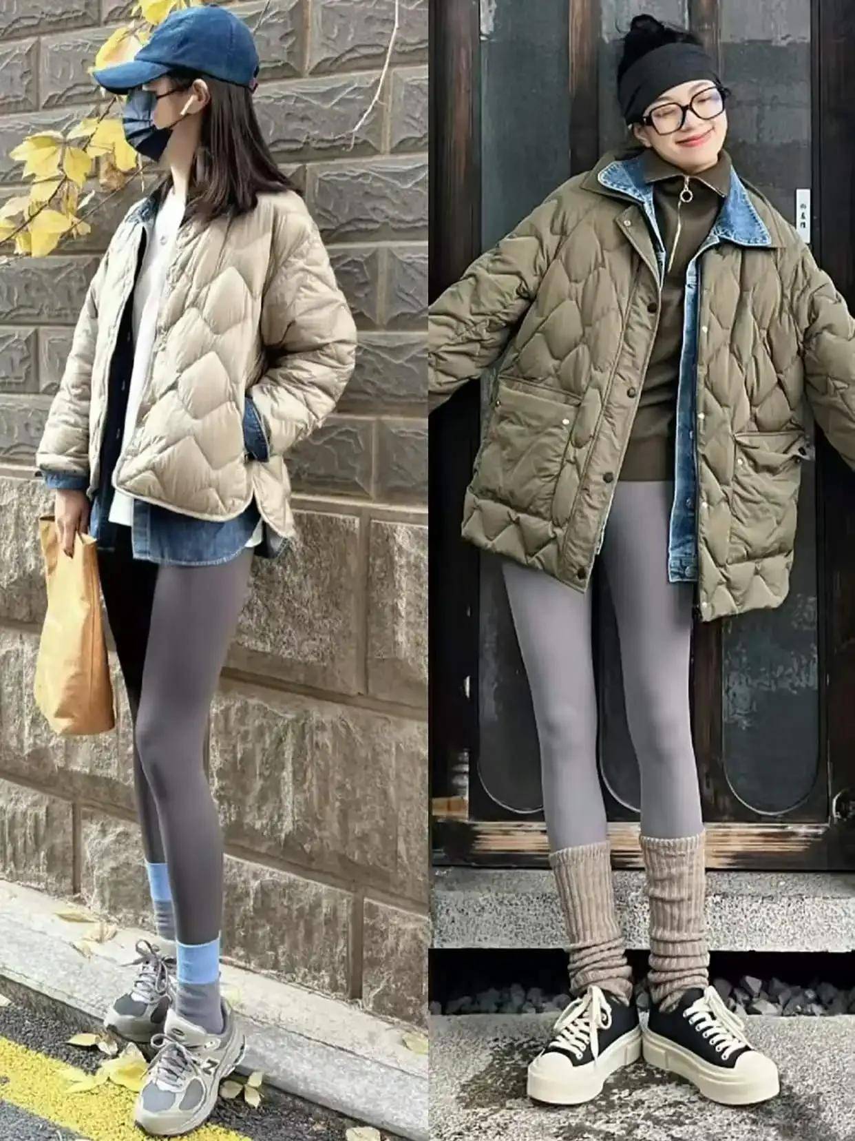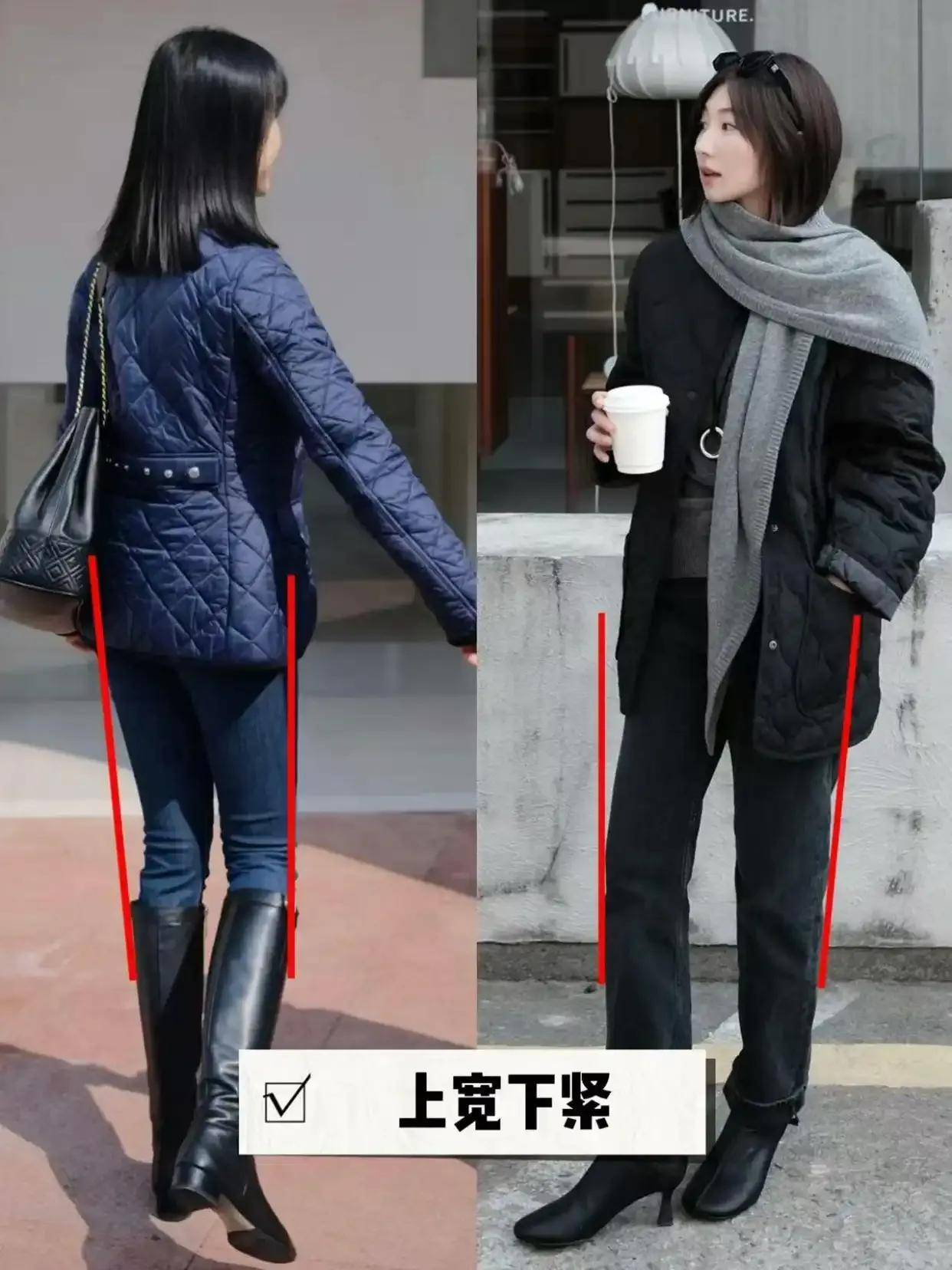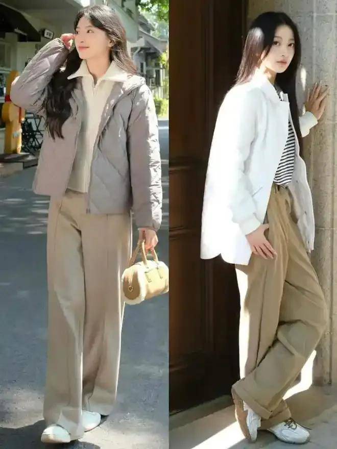 九分直筒裤:露出踝部+短靴,利落显高,适合通勤(如卡其色直筒裤配灰色棉服)。