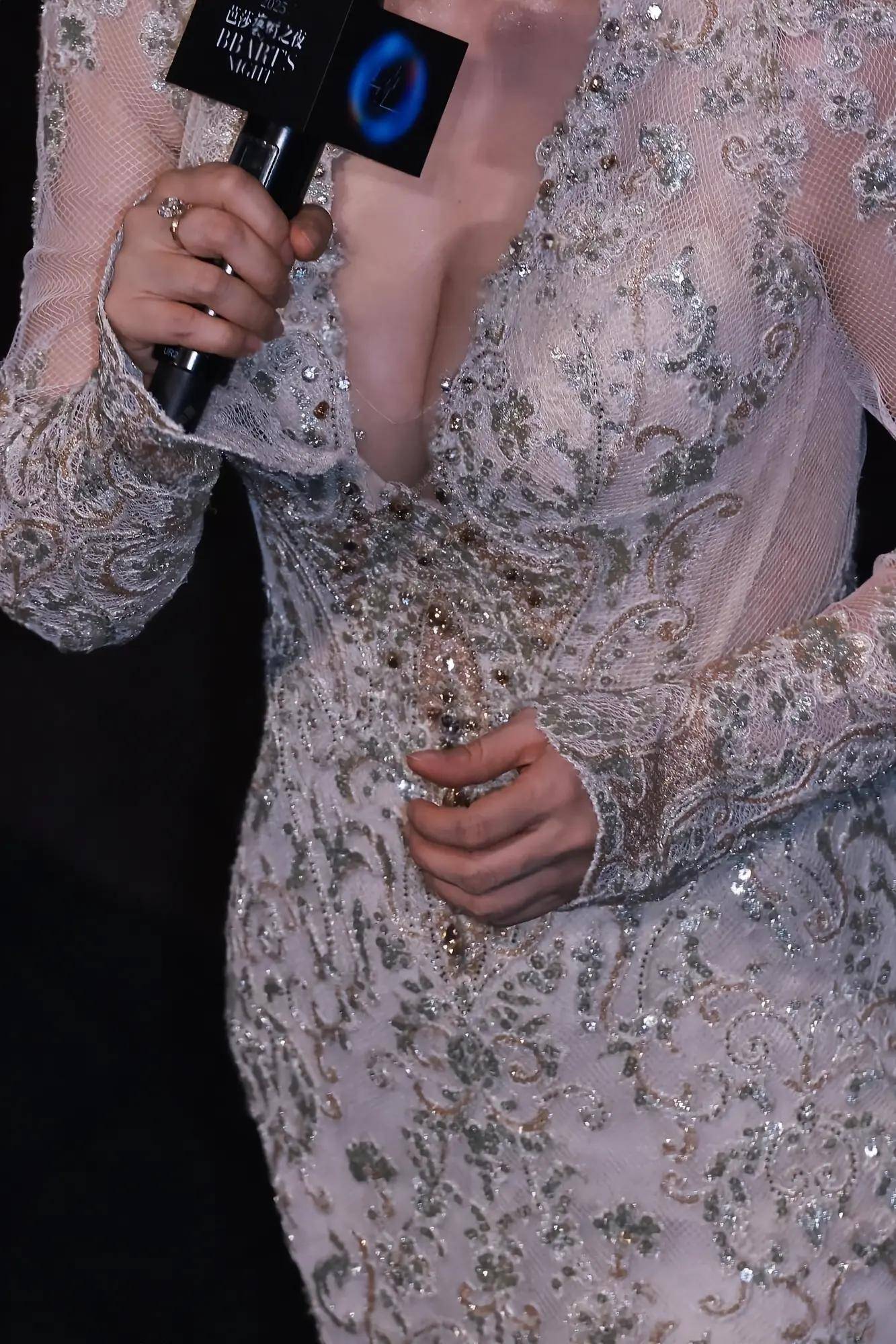 先说说这条裙子本身,那设计简直太有巧思了。银色,本身就是一种自带高级感和神秘感的颜色,在灯光下闪烁着冷冽又迷人的光泽,就像夜空中最亮的星,一出场就吸引了所有人的目光。深V的设计,大胆又性感,完美地展现了黄奕精致的锁骨和优美的颈部线条,还若隐若现地透露出她的事业线,既不会过于暴露显得俗气,又恰到好处地增添了几分女人味,让人忍不住多看几眼。