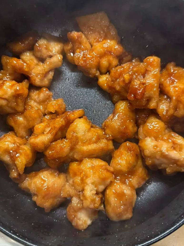 图片8:锅中橙黄色酱汁包裹块状食物 → 极可能为橙皮鸡烹饪过程;