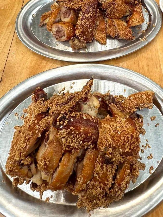 图片11:两盘撒满白芝麻的棕褐色鸡肉 → 正是典型的芝麻鸡形象!银盘+木质背景也符合餐厅摆拍风格;