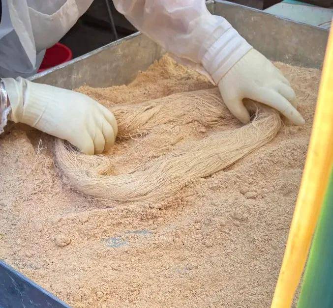 图片4:戴手套手操作丝状物下方沙土 → 可能是龙须酥制作过程!丝状物即拉出的糖丝,沙土用于防粘——此图极可能展示龙须酥的手工拉制工艺!