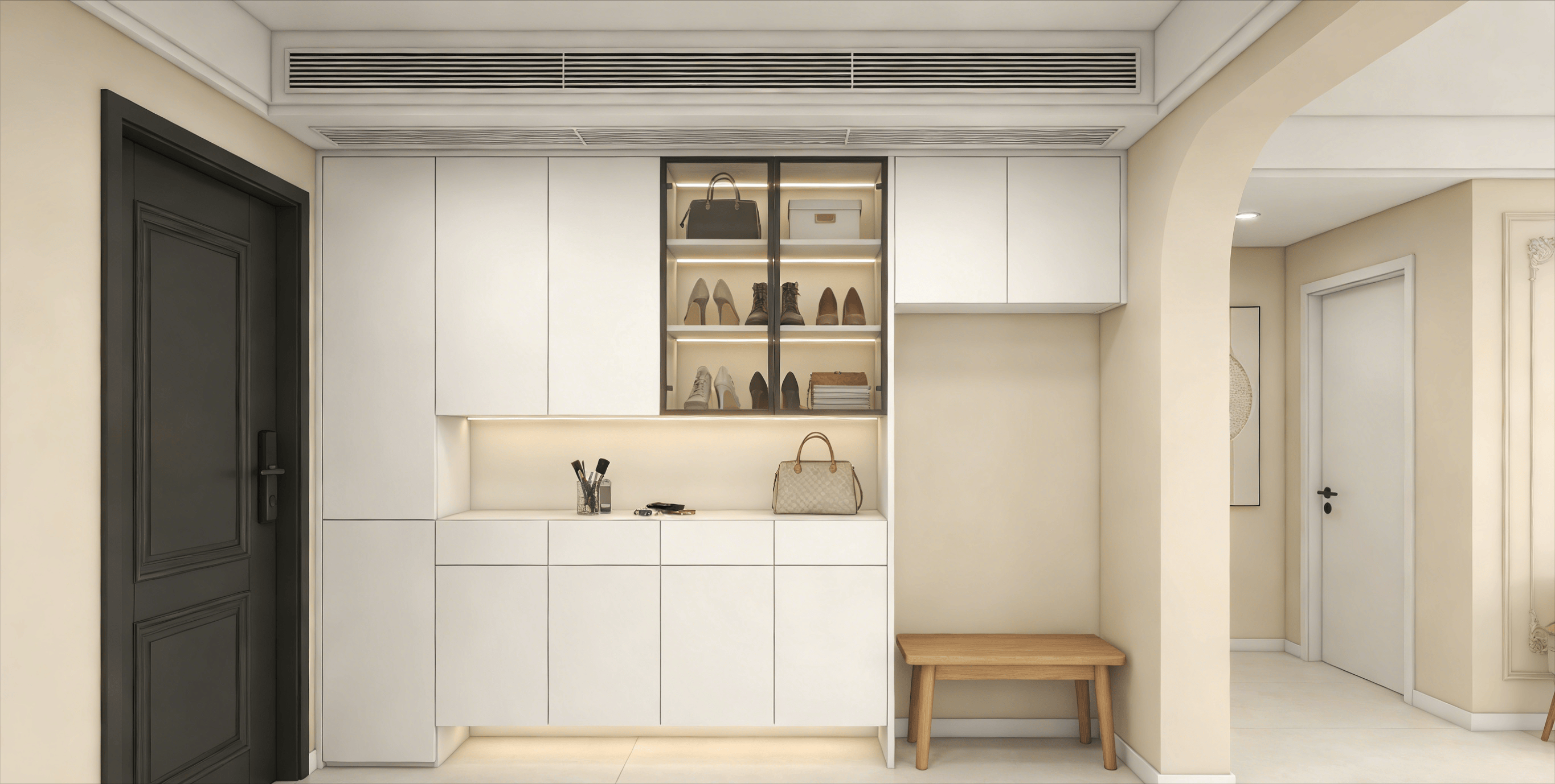 | 鞋柜设计 | 奶白色哑光烤漆鞋柜,采用“上柜+中部留空+下柜悬空”三层结构:<br>• 上柜:封闭式,收纳换季鞋履与杂物<br>• 中部留空(嵌灯带):放置钥匙、包包、笔筒等常用物品,夜间归家即亮<br>• 下柜悬空15cm:常穿拖鞋可随手踢进,避免地面杂乱 |