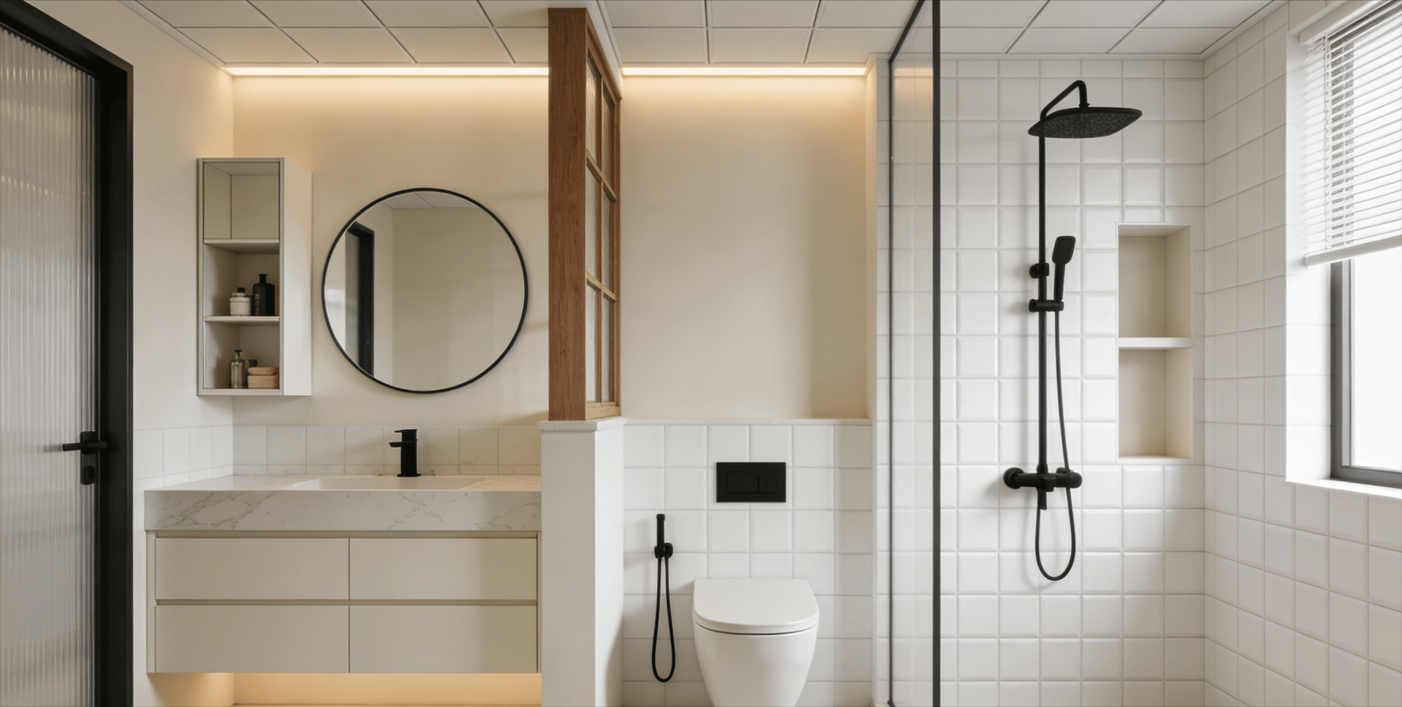 卫生间采用半墙干湿分离设计,干区做悬浮式奶白色浴室柜,搭配岩板台面与圆形浴室镜,镜柜内置收纳空间,隐藏洗漱用品,保持台面整洁。半墙隔断上预留木质窗口,增强采光与空间互动感,避免干区昏暗。湿区选用壁挂式马桶,节省地面空间且便于清洁,墙面贴白色方形哑光砖,搭配黑色五金件,形成冷暖对比,精致又耐看。