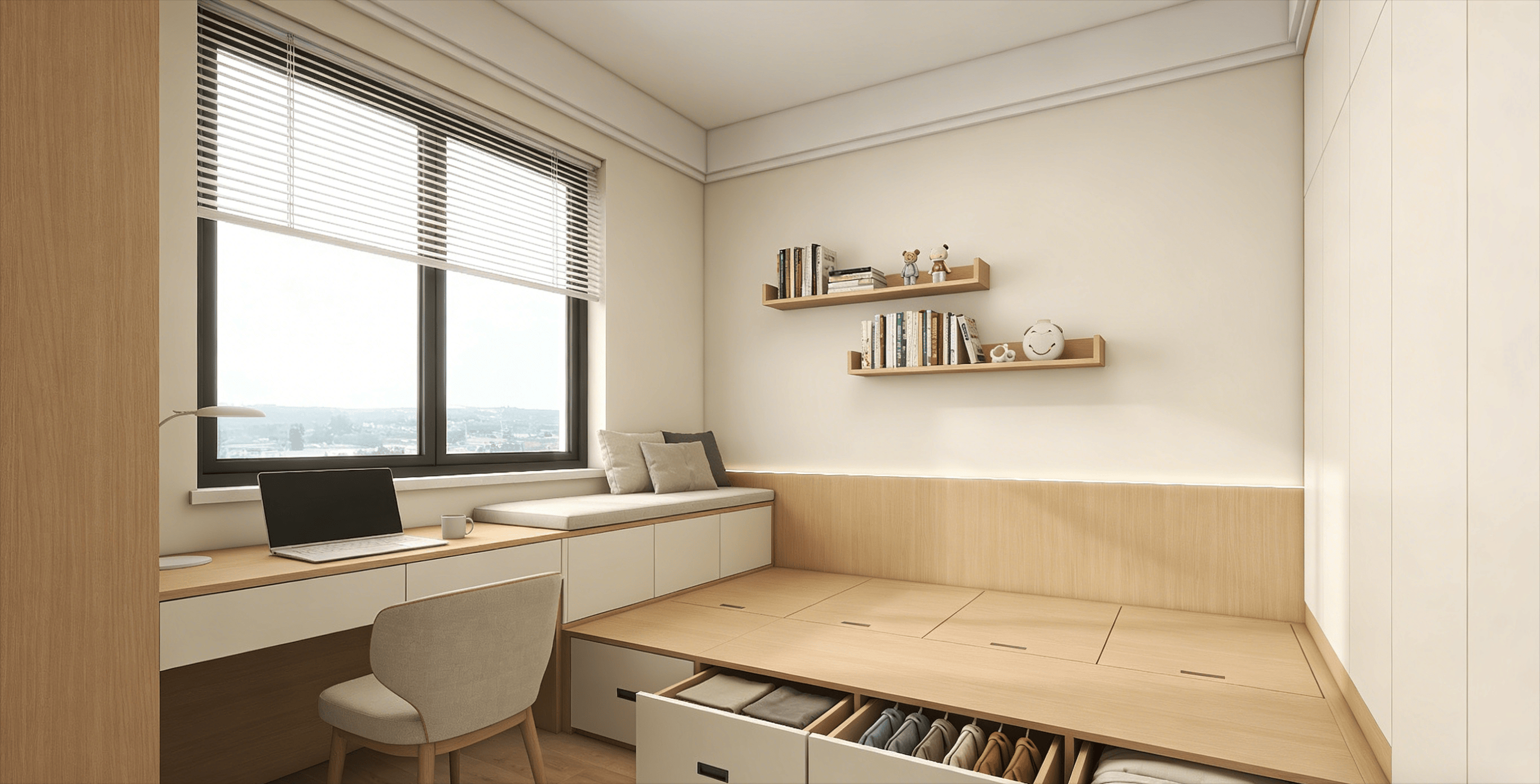 北次卧:浅原木榻榻米房,储物箱收纳换季衣物,窗边矮柜书桌满足临时休憩或长辈居住。
