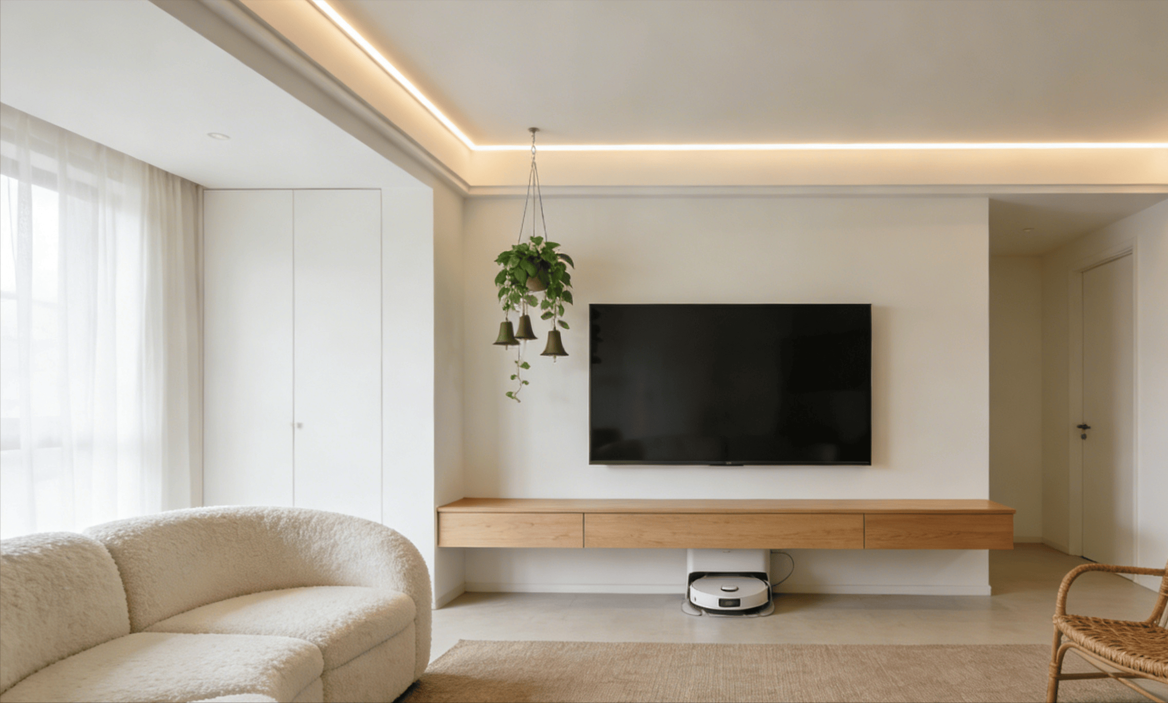 沙发选择米白色弧形羊羔绒款,模块化设计适配小空间,坐深55cm的尺寸保证舒适感,搭配浅咖色棉麻地毯与藤编单人椅,柔化空间线条的同时注入自然气息。电视背景墙摒弃复杂造型,保留纯粹的奶白色墙面,搭配悬浮式原木电视柜,下方预留扫地机器人活动空间,整洁又显轻盈。电视柜上摆放一株吊钟绿植与肌理感装饰画,无需过多点缀,便让空间充满生机。
