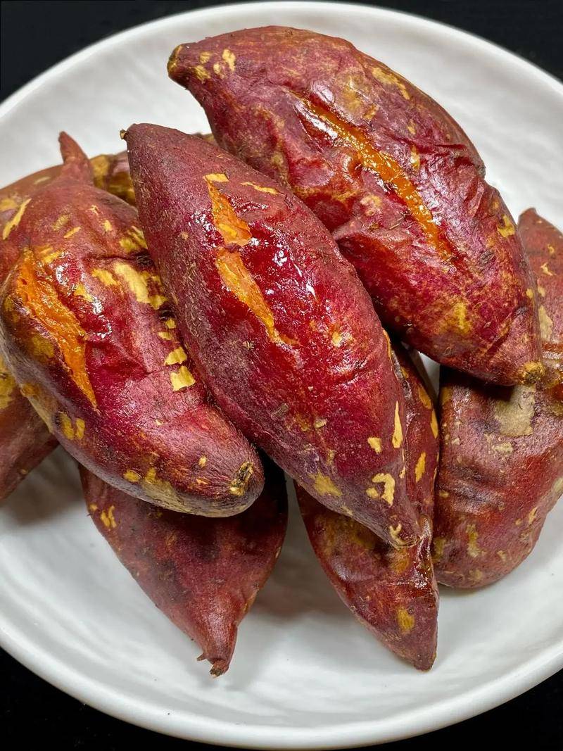 烤红薯是最经典的吃法,用空气炸锅做更是省心又美味,不用守在灶台旁,就能吃到外皮焦脆、内里流心的口感。食材:红薯 2-3 个(选中等大小、表皮光滑的)做法:红薯洗净擦干表面水分,用叉子在表皮扎满小孔(防止烤爆),放入空气炸锅篮中,180℃烤 30-35 分钟,中途翻面一次。烤至红薯表皮发皱、用手捏着发软,就说明熟透了。口感:外皮薄脆带点焦香,内里绵密细腻,甜香浓郁,咬一口还能看到微微流心的糖汁,暖乎乎的超治愈。追剧时烤两个,既是零食也是主食,方便又解馋。