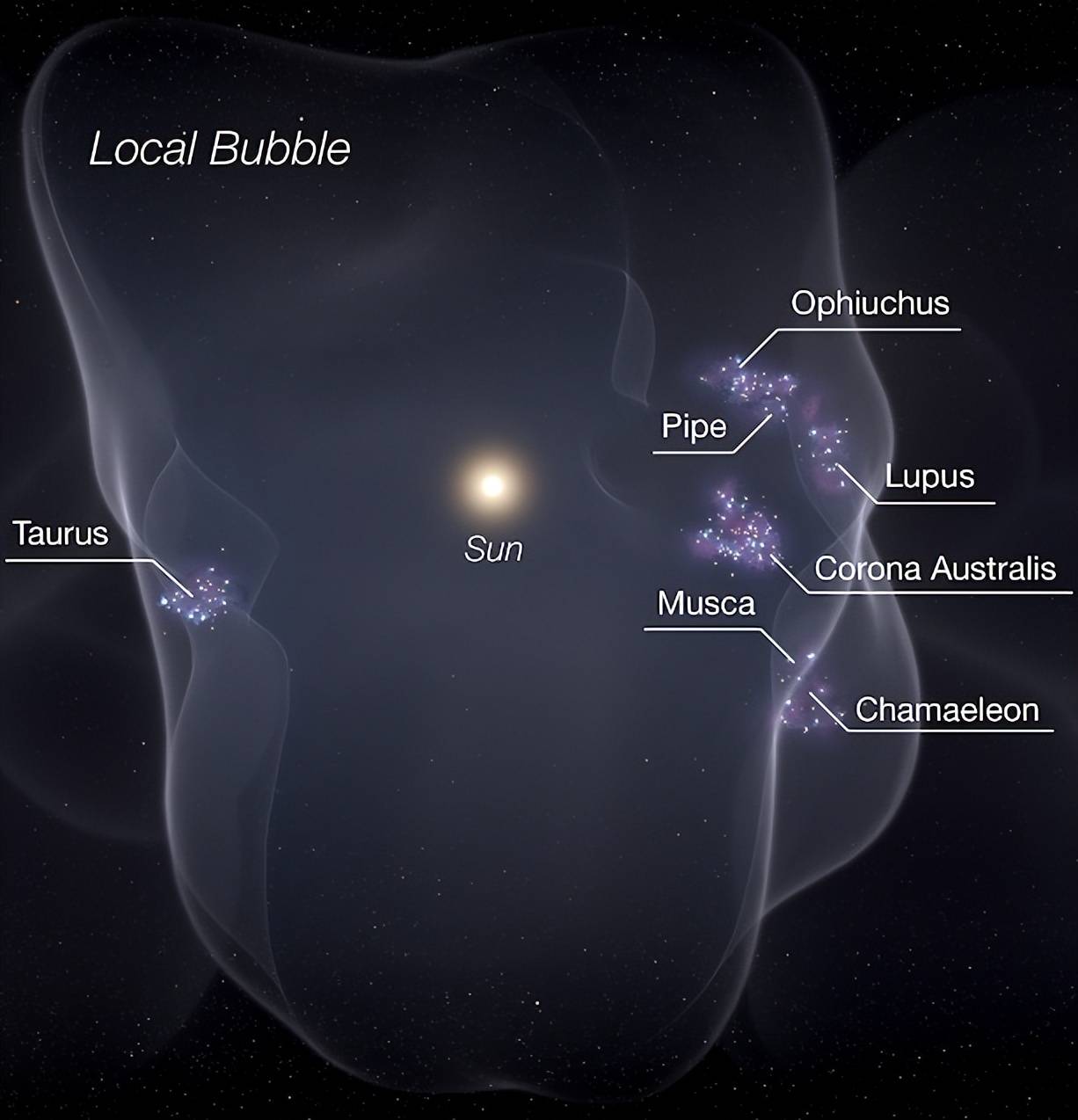当骑手靠近猎户座悬臂时,他会进入一个直径约300光年的空腔,这叫作局部泡,这是几千万年前一场超新星爆炸留下的遗迹,那场剧烈的爆炸吹走了周围所有的气体和尘埃,留下了一个相对纯净的真空区。
