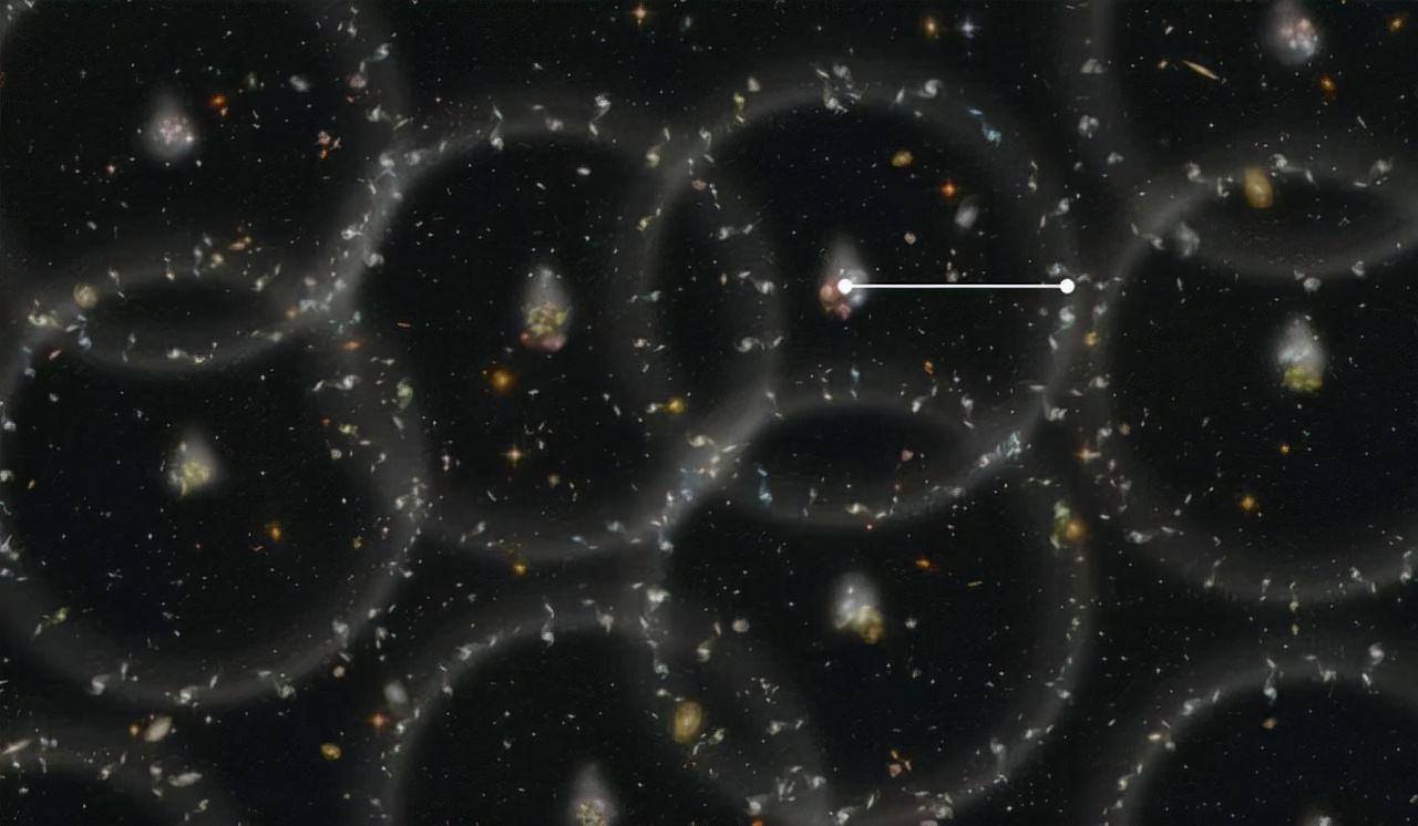 假设骑手运气爆棚,撞进了我们的宇宙,迎接他的是一片直径930亿光年的球形空间,在这里,没有任何方向感可言,因为宇宙是各向同性的,他必须寻找“地标”,于是他锁定了武仙座-北冕座长城。
