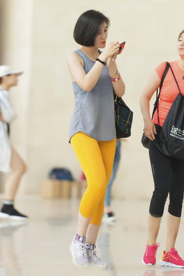 这样的搭配没有攻击性,却像一杯温温的蜂蜜水,喝下去连喉咙都甜。她们站在那里,或走或停,瑜伽裤的面料随着动作轻轻贴在腿上,像流水般自然;上衣的短款露出的腰腹,像春天的嫩芽,带着点青涩的可爱;连眼镜都成了温柔的装饰,像把校园里的文艺感搬到了街头。
