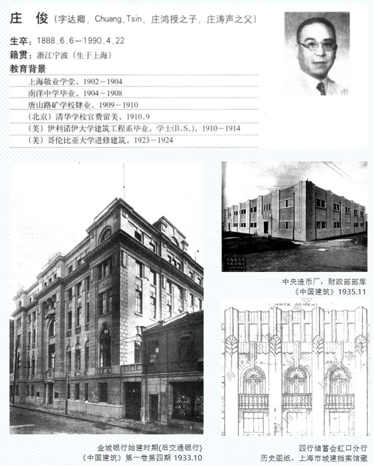 建筑师庄俊,是近代中国第一位留学美国学习建筑学科的建筑师,1914年毕业于伊利诺伊大学,也是第一代中国建筑师的代表人物。1925年,他在上海创办庄俊建筑师事务所,曾于交通部华北建筑工程公司、中央设计院、华东工业设计院任总工程师。庄俊开立事务所期间,受交通银行委托项目较多,主持完成的项目包括济南交通银行、哈尔滨交通银行、大连交通银行、徐州交通银行、青岛交通银行及其仓库等。庄俊对不同建筑风格运用自如,从古典主义、装饰艺术至现代主义均有极优秀的作品。